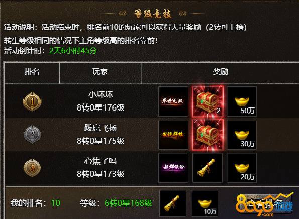 【活动内容】:活动结束时,玩家等级榜前10的玩家可以获得大量奖励,同样等级先达到的排名在前!