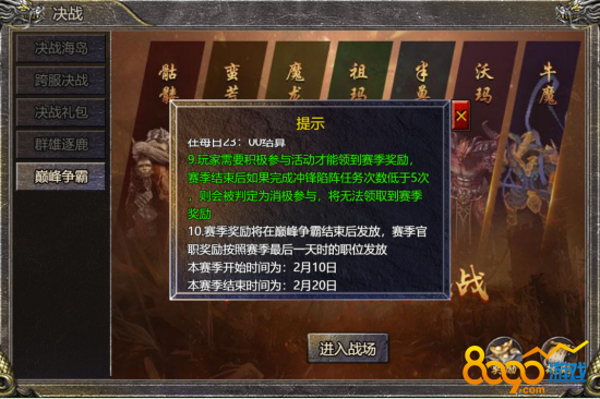d. 期间尽情提高巅峰争霸中的战力吧,活动结束会根据官职和阵营排行发放丰厚的奖励