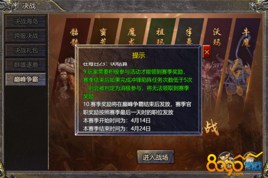 d. 期间尽情提高巅峰争霸中的战力吧,活动结束会根据官职和阵营排行发放丰厚的奖励