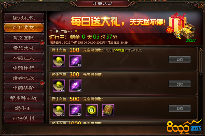 活动期间,玩家每日累计充值达到指定额度即可领取丰厚奖励。