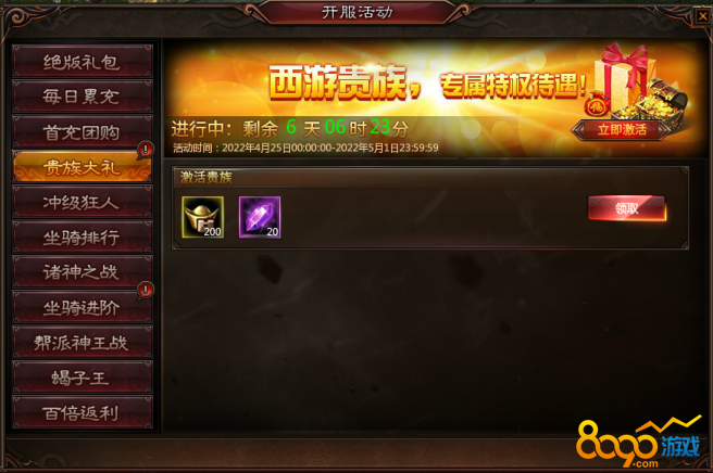 活动期间,激活西游贵族除可领取专属特权待遇外还可额外领取激活福利一份!