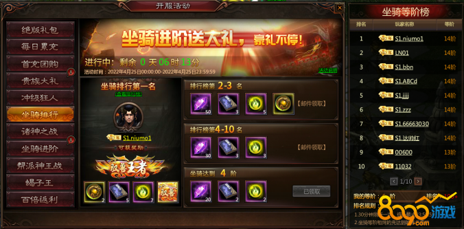 (1) 活动结束时统计坐骑排行,排名靠前的玩家可获得包含【专属称号】在内的丰厚奖励;