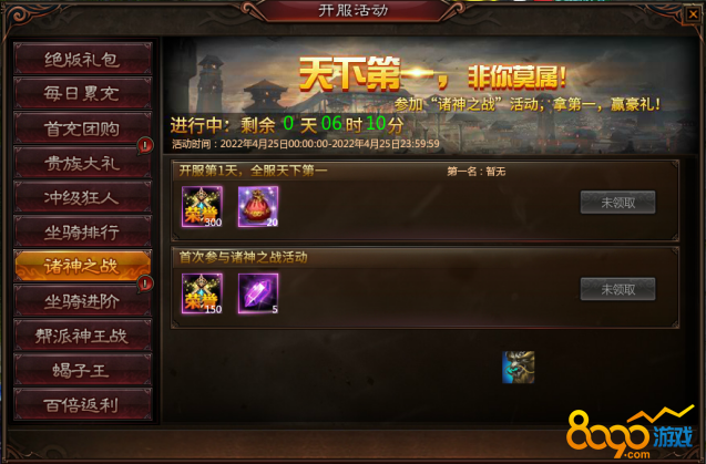 (1) 活动期间,每天参与“诸神之战”活动获得第一名的玩家可领取丰厚奖励