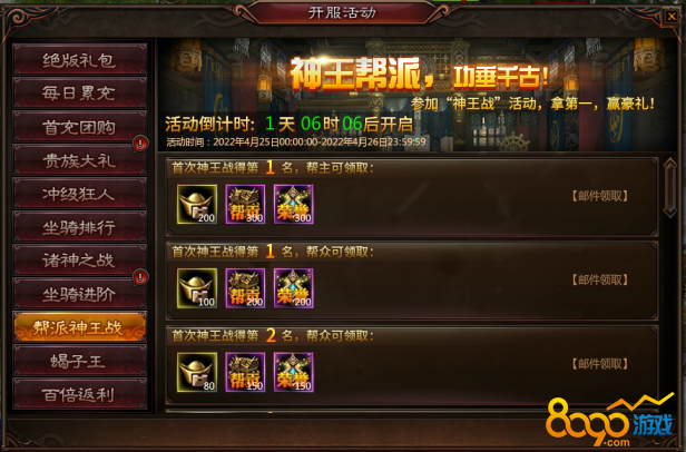 (1) 活动期间,参与“神王战”活动,获得第一名的帮派其帮主和帮众均可获得丰厚奖励!