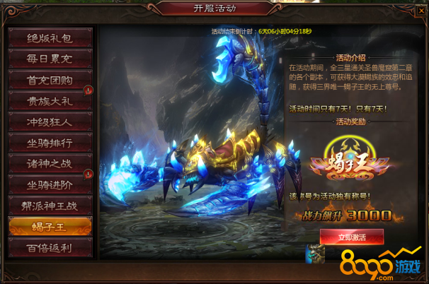 活动期间,全三星通关圣兽魔窟第二章各副本即可免费领取“蝎子王”无上尊号,战力急速飙升!