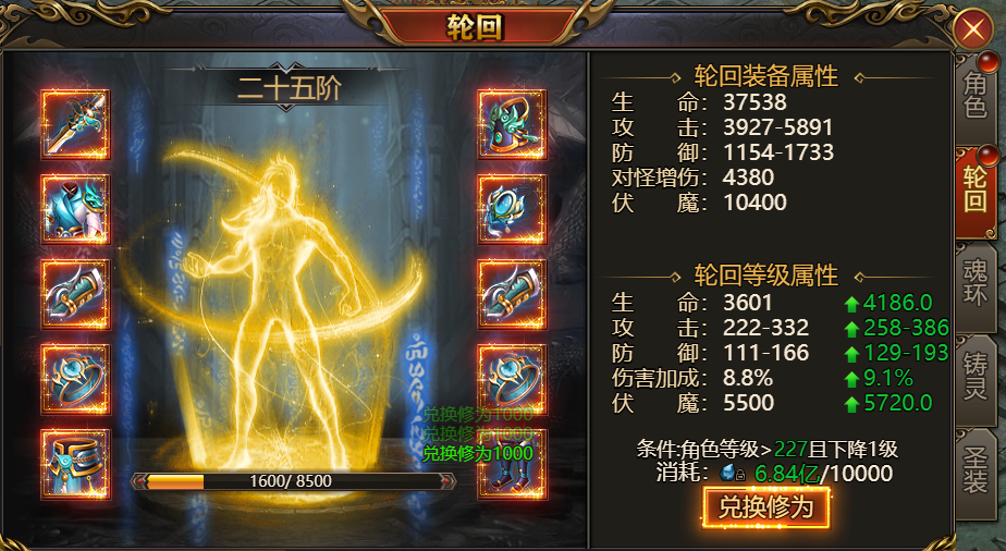 (2)穿戴轮回装备提升伏魔值,根据伏魔值进入不同层级轮回神殿,击杀怪物获得对应等级轮回装备。轮回装备有6件套属性和10件套属性,可以增加伏魔值和对怪伤害。轮回神殿怪物从3阶开始有针对伏魔值的盾,破盾后才能击杀。