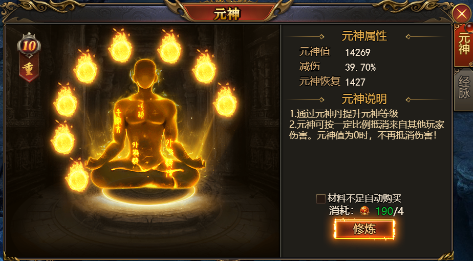 通过元神丹进行升级,元神可按一定比例抵消来自其他玩家的伤害,共一百重