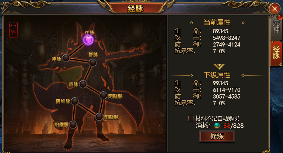 通过经脉丹打通七经八脉,升级获得属性加成,共十阶八星,经脉丹主要产自通天塔