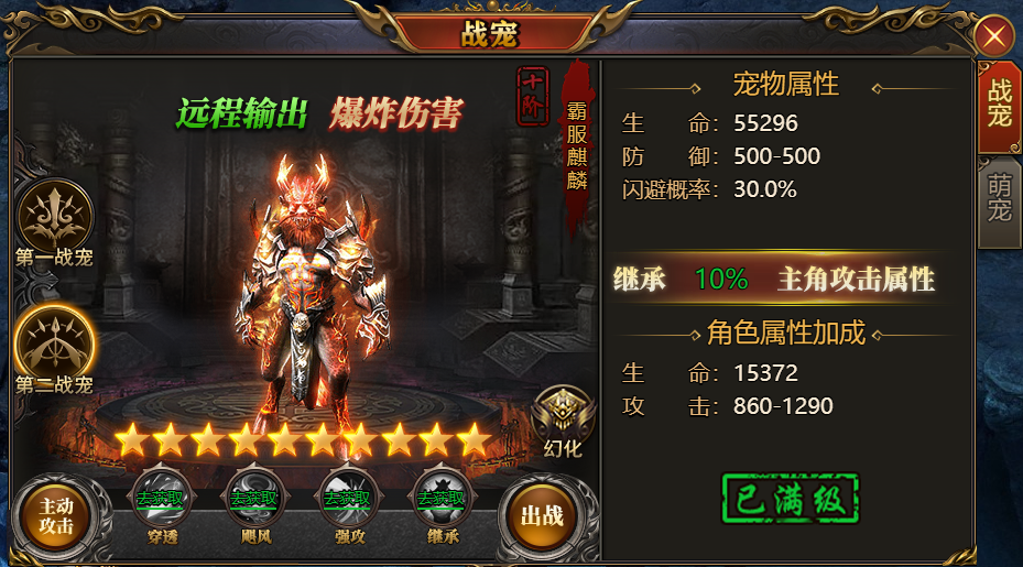 (1)战宠帮助角色攻击怪物,不能被玩家攻击,不能攻击玩家。战宠自带30%闪避属性,可通过技能书将闪避概率提升至100%。战宠共十阶十星,使用绑定灵石升级战宠,提高战宠属性,对角色的加成。