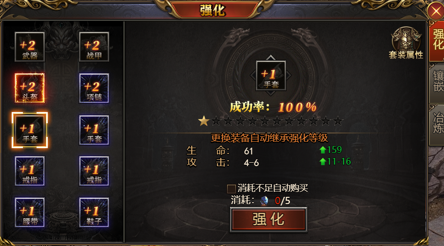 (1)消耗乌铁矿可对角色装备部位进行强化,提升装备的属性,装备强化后替换别的装备不影响属性加成;