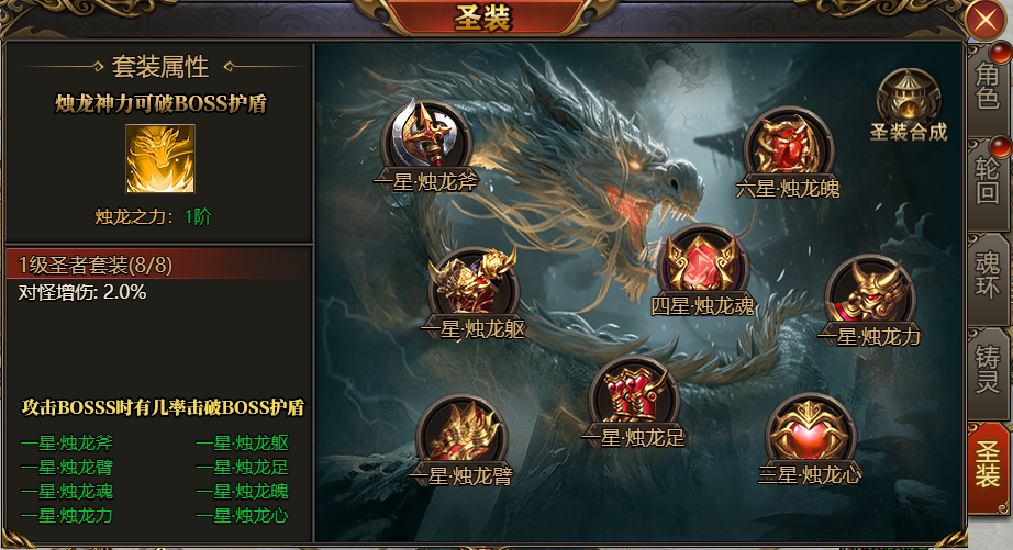 圣装共八件十阶,每件都有单独属性,针对特殊护盾怪物,穿戴一套圣装后,获得套装属性加成,攻击时有几率打破对应等阶boss护盾,可通过合成进行升阶。