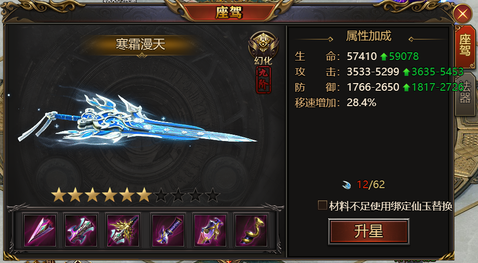 (1)法器至少升星一次后激活,激活后获得属性加成,共二十阶十星,使用玄铁碎片进行升级。在副装神殿中可获得专属副装,集齐套装后增加座驾属性。