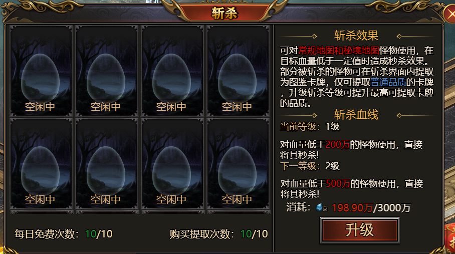 (1)激活斩杀系统后攻击500级以上boss可触发斩杀技能,根据斩杀等级可直接击杀低于一定血量的怪物,激活至尊月卡可解锁自动斩杀和提高斩杀血量