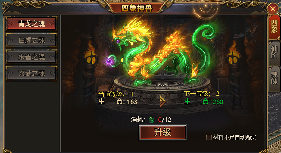 四象之魂分别对应生命值,攻击,防御,暴击率暴击伤害。通过材料副本和打怪获取四种四象丹,升级四象之魂提升对应属性。