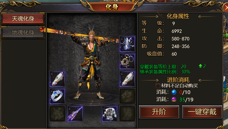 (2)两个化身开启条件不同,化身可使用化身丹升阶,升阶提升属性,并提升化身可穿戴装备等阶。达到指定等阶需要额外材料进行突破