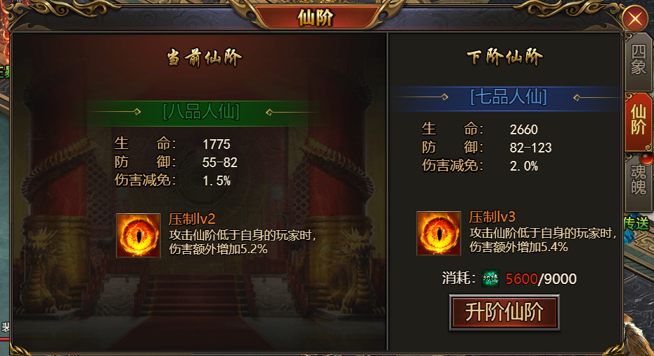 使用功德值对仙阶升阶,提高角色生命,防御,伤害减免属性,PK加成。功德值通过每日降妖伏魔任务仙盟夺旗奖励获得,从九品人仙到混元金仙共38级。