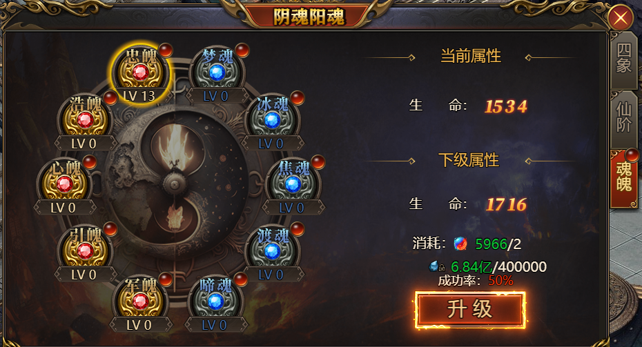 十种魂魄对应十种属性,生命,诛邪,攻击上下限,防御上下限,神圣攻击,神圣防御等。升级可提升对应属性,升级可能失败,不同等级成功率不同,升级失败会提升当前成功率,最高等级100级。
