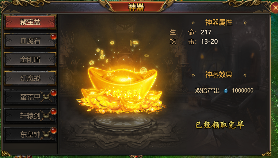 角色等级达到76级完成主线任务开启,后续根据西行之路进度逐个开启,不同神器对应增加属性不同,分别增加生命加成,伤害减免,伤害加成,无视防御,攻击,对怪增伤。怪物掉落一定神器碎片,消耗神器碎片和神器突破石可对神器升级升阶,增加神器属性和效果。轩辕剑和东皇钟需要消耗仙玉开启。