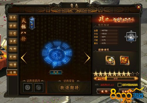 法阵系统玩家可以通过等级开启,带来高战力及特殊技能。法阵的进阶需要消耗法阵进阶丹,当升阶经验满后可以提升一颗星星,当星星满后可以进行进阶。法阵进阶后,可以获得不同的外显,品阶越高外显越华丽,法阵技能也会跟随法阵的品阶进行升级。