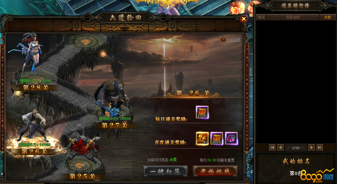 1)六道轮回每1关为1个BOSS,随着关数向上,看守怪击杀难度相应递增。