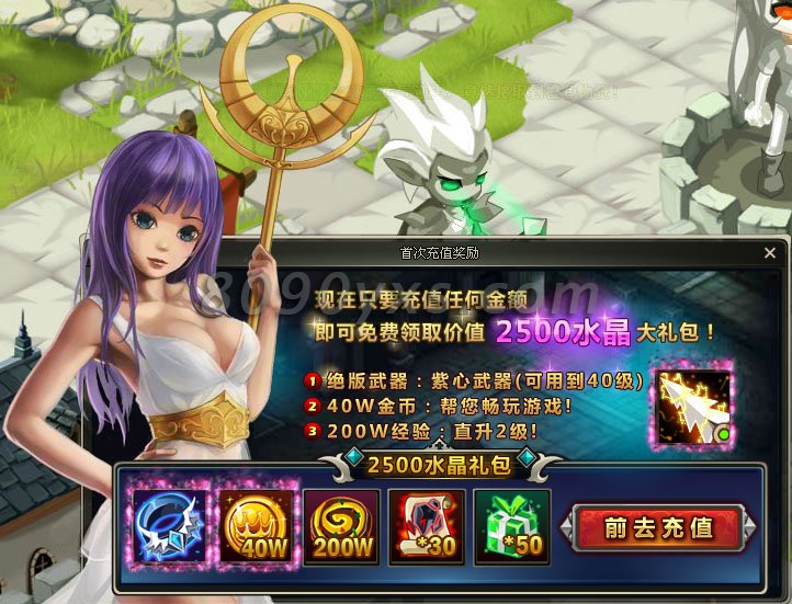 活动內容:只要充值100水晶即可获得价值2500水晶的首冲礼包!