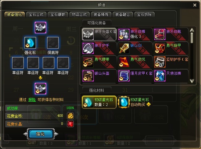 装备强化:装备可以通过使用星光石进行强化升级,升级过程中可以使用幸运卷轴来提高成功率,当背包中缺少星光石时,可以点击自动购买星光石,这个在强化中很方便,再也不用一个一个的购买。