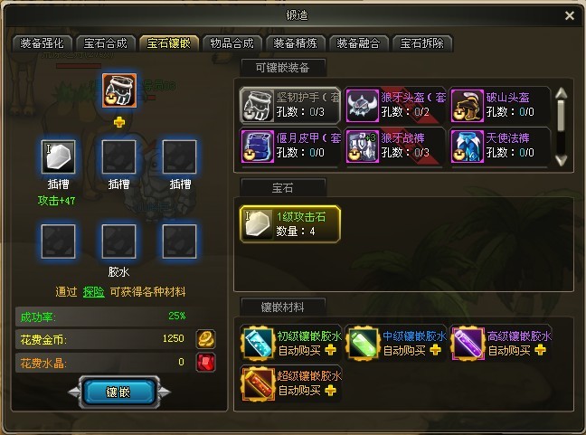 宝石镶嵌:可以装备的孔数决定宝石的镶嵌个数。