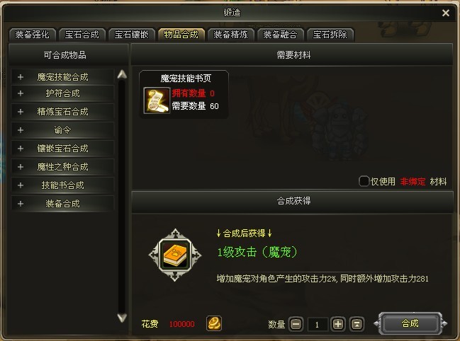 物品合成:可合成物品分为魔宠技能合成、护符合成、精练宝石合成、谕令、镶嵌宝石合成、魔性之种合成、技能书合成、装备合成部分。大家可以根据后面介绍的所需材料合成你所需要的物品。