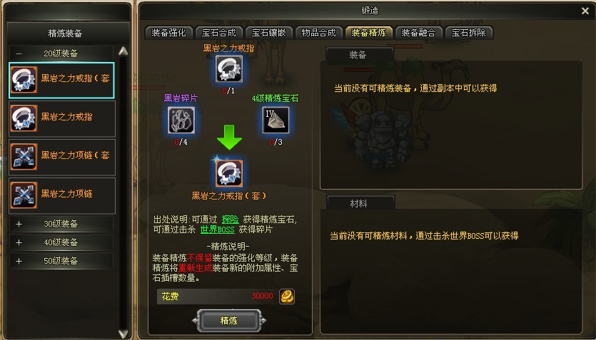 装备精练:不同等级的装备使用不同的碎片和精练宝石精练出顶级装备和饰品。装备精练是不保留装备的强化等级的,装备精练将重新生成装备新的附加属性、宝石插槽数量。