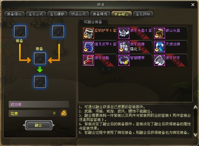 装备融合:可以通过装备融合获得自己想要的套装部件,但是武器、项链、戒指、腰饰不能融合,融合需要消耗一件紫装以上品质和两件与紫装以上品质同职业的套装,另外融合时紫装是决定融合后的装备部件,套转是决定融合后获得装备的属性与套装效果。