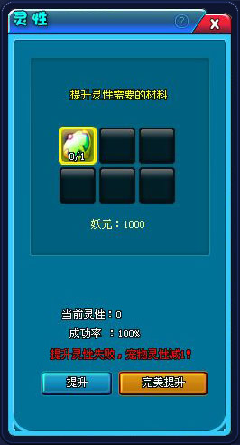 提升灵性需要消耗悟化丹和妖元,等级不同消耗的数量不同。