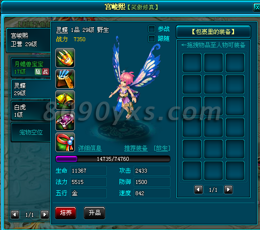 在修真世界中,任何野外怪物都可以抓来做宝宝,每个宝宝都可以装备五件装备,装备可以在城里的招财处购买。