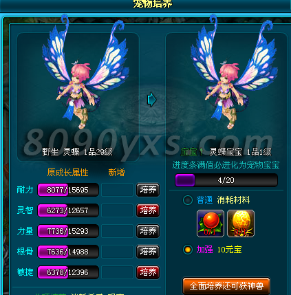 点击培养后,可对宠物进行相应提升,可以根据需要选择提升宠物的属性,消耗的妖元可以通过副本或者任务获得。对宠物进行元宝培养还可将其培养成神兽哦。