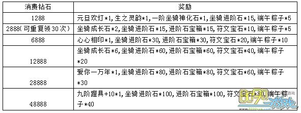 活动内容:活动期间充值1钻石并消费1钻石可获得1积分,用积分可以兑换各种珍稀道具。