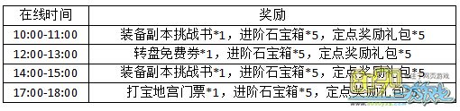 活动内容:在活动时间内,每日10:00-11:00、12:00-13:00、14:00-15:00、17:00-18:00,只要在线即可领取奖励1份。