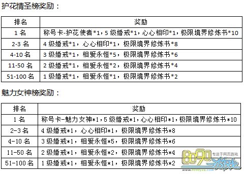 活动内容:每天开启1次跨服鲜花榜,根据收花、送花的数量进行排行,其中男性是“护花情圣榜”,女性是“魅力女神榜”,按照排名可获得对应的奖励,奖励在次日通过邮件发放。