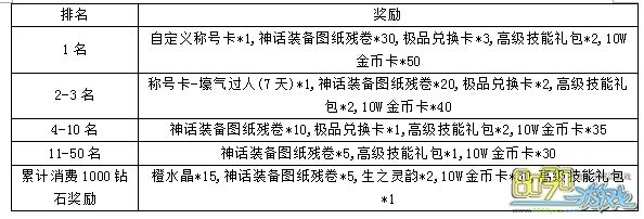 活动内容:在活动时间内,根据玩家的消费钻石数量进行排名。累计消费达到1000钻石才可以入榜排名,且同时可以领取奖励1份。而排名奖励则在活动结束后通过邮件发放。