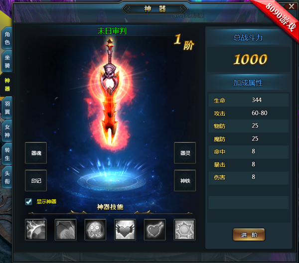 目前,游戏中共有8阶神器,分别为:末日审判(1阶)-到达82免费赠送获得、雷神之锤(2阶)、死神巨镰(3阶)、海神圣戟(4阶)、冥王之剑(5阶)、永恒之枪(6阶)、雷霆之怒(7阶)、诸神黄昏(8阶),想要进阶到最强,还得一步一步来咯!