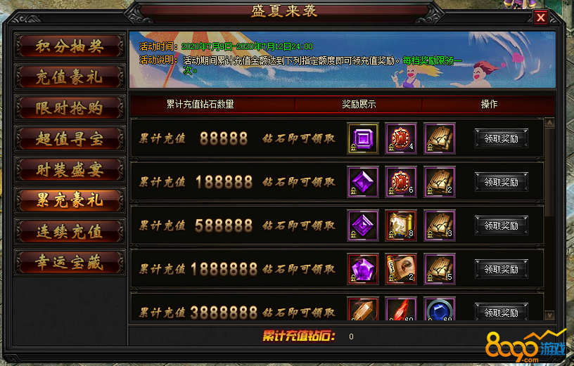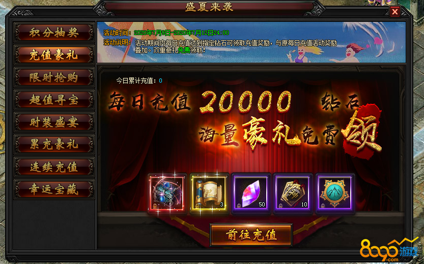 8.2活动期间每日充值达一定金额可领取奖励。