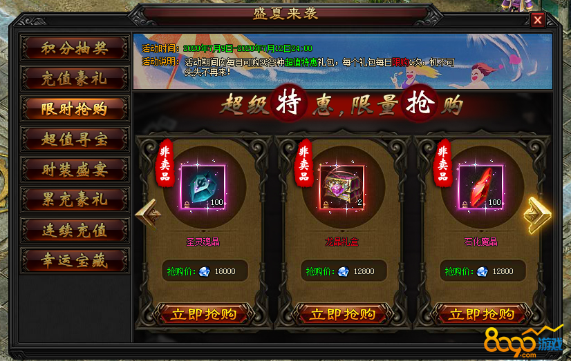 3.2. 活动期间内,每日可购买各种非卖品特惠礼包,每个礼包每日限购1次。