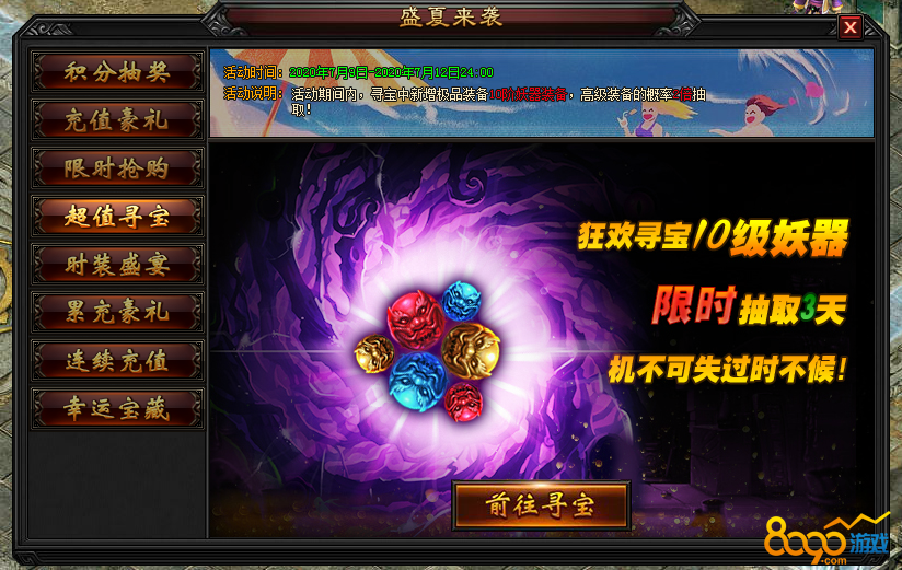 4.2 活动期间内,寻宝中新增10阶妖器装备,并且高级装备的概率双倍抽取