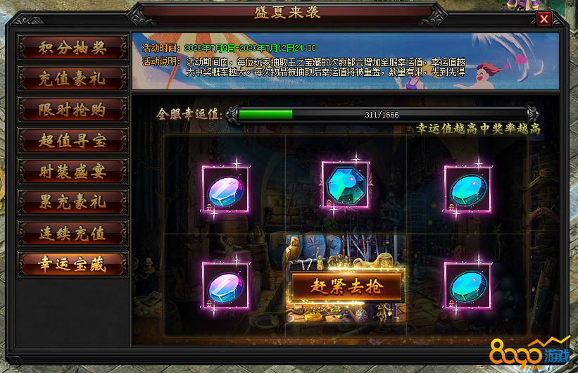 7.1 活动期间内,全服玩家在抽取王之宝藏的时候都会增加全服幸运值