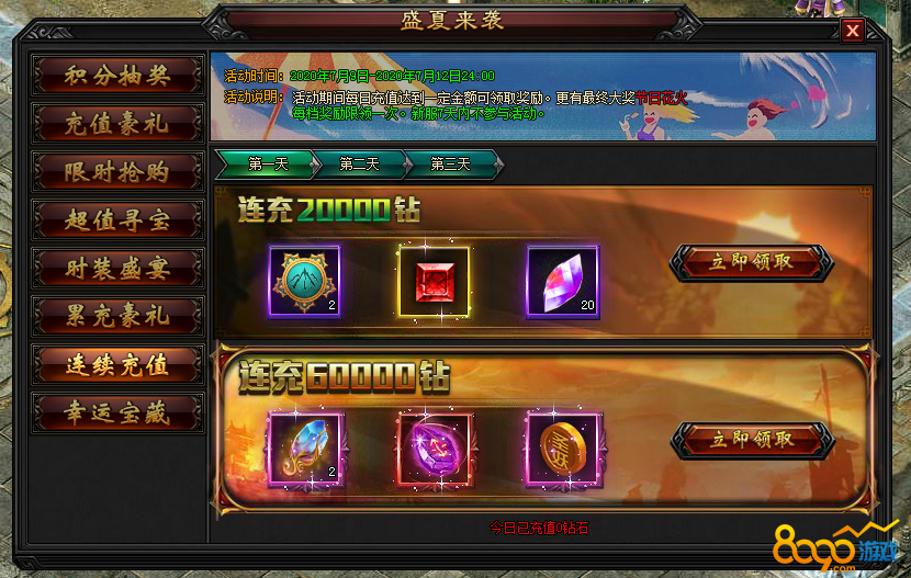 2.2 活动期间内,每日充值达指定钻石数额,即可领取充值奖励,可原每日充值奖励叠加领取