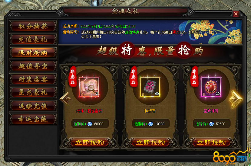 3.2. 活动期间内,每日可购买各种非卖品特惠礼包,每个礼包每日限购1次。