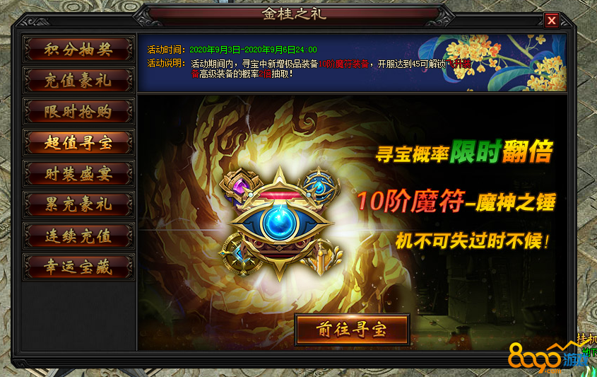 4.2 活动期间内,寻宝中新增魔符装备,并且高级装备的概率双倍抽取