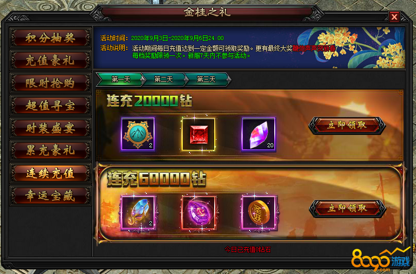 2.2 活动期间内,每日充值达指定钻石数额,即可领取充值奖励,可原每日充值奖励叠加领取