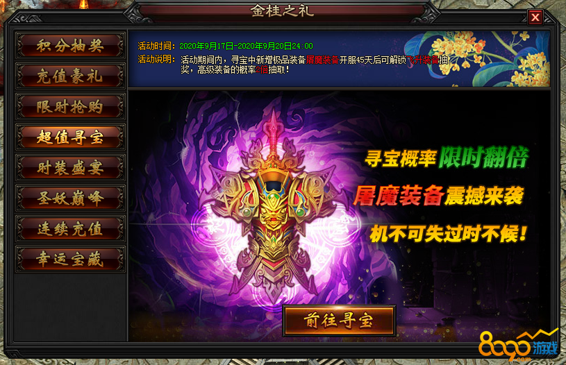 4.2 活动期间内,寻宝中新增屠魔装备,45天后解锁飞升装备。并且高级装备的概率双倍抽取