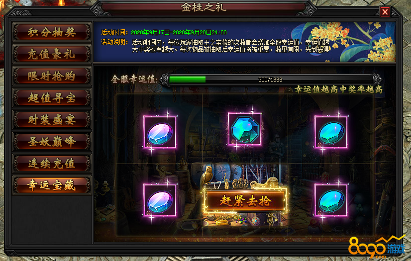 7.1 活动期间内,全服玩家在抽取王之宝藏的时候都会增加全服幸运值