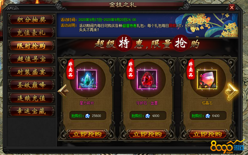 3.2. 活动期间内,每日可购买各种非卖品特惠礼包,每个礼包每日限购1次。
