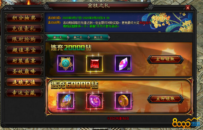 2.2 活动期间内,每日充值达指定钻石数额,即可领取充值奖励,可原每日充值奖励叠加领取